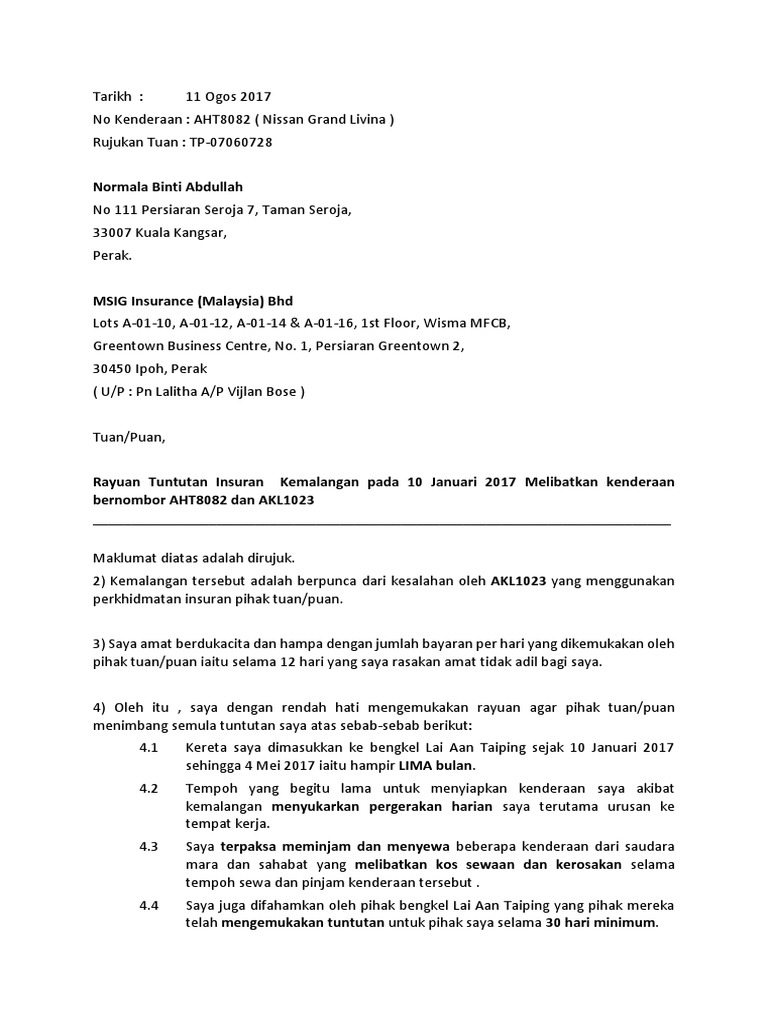 Surat Tuntutan Claim Kenderaan Insurans. Results for contoh surat rasmi rayuan insurans translation from English to Malay. Bagi sesetengah keadaan kadang kala Surat Rayuan perlu ditulis dan dihantar bagi urusan-urusan tertentu.